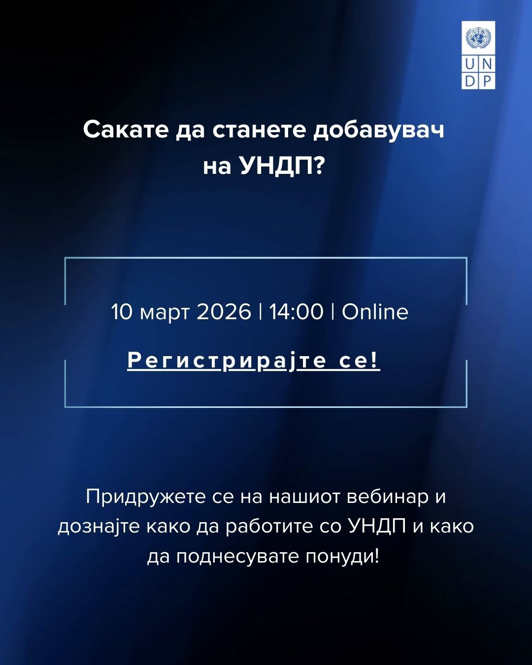 Доколку сте заинтересирани да станете добавувач на УНДП, ве покануваме да се пријавите на бесплатен онлајн семинар кој ќе се одржи на 10 март 2026 година во 14:00 часот.