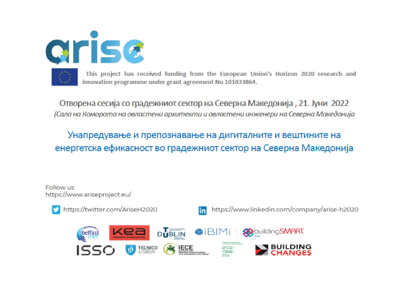 Проектот ARISE цели кон обучување на професионалци во градежниот сектор за проектирање и изведба на енергетски ефикасни згради, со користење на информациско моделирање на градбите (BIM). Проектот ќе придонесе кон придвижување на градежната индустрија кон енергетски ефикасна средина преку стимулирачки пристап за зголемување на побарувачката за одржлива енергија и дигитални вештини во секторите архитектура, инженерство и градежништво.