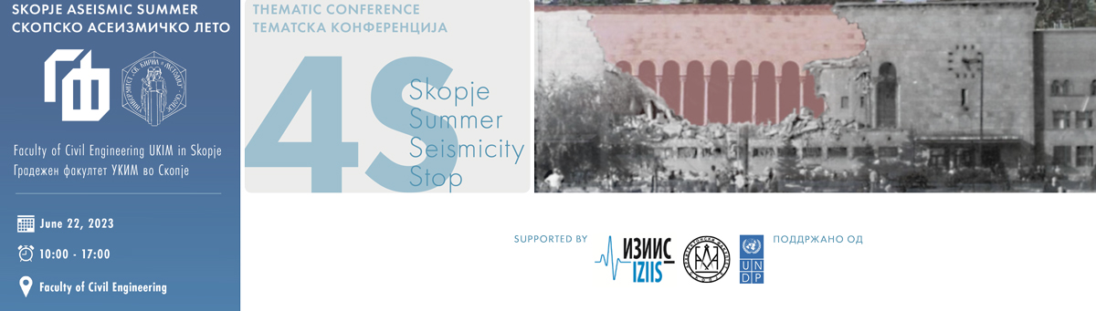 Во рамките на серијата активности насловени како СКОПСКО АСЕИЗМИЧКО ЛЕТО на Градежниот факултет, УКИМ во Скопје на 22.06.2023 (четврток) ќе се организира еднодневна тематска конференција „4S – Skopje Summer Seismicity Stop“. Настанот е поддржан од Институтот за земјотресно инженерство и инженерска сеизмологија, Архитектонскиот факултет УКИМ во Скопје, Друштвото на градежни конструктори на Македонија и UNDP. Преку излагањата на повиканите предавачи од земјата и странство, аудиториумот ќе има можност да се запознае со најновите истражувања, трендови, технологии и достигнувања во областа на изградбата на објекти отпорни на земјотрес.