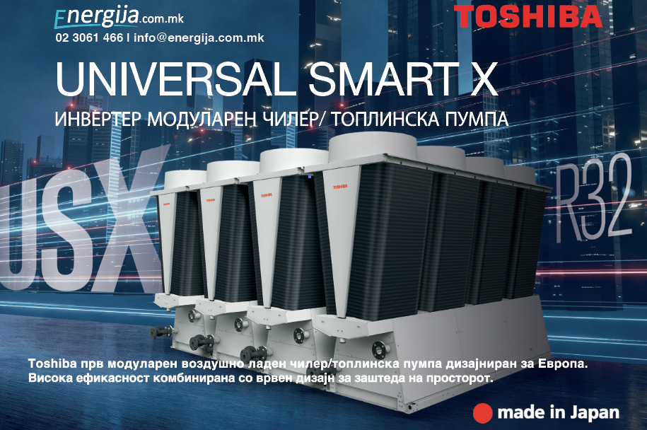 Ве покануваме на настан организиран од Енергија доо и TOSHIBA Air Conditioning, овластен дистрибутер за Toshiba во Македонија, специјализирана компанија за уреди и системи за ладење, греење и климатизација иноватори на инвертер технологија. Темата на овој настан ќе биде иновативни TOSHIBA USX модуларни инвертер чилери/топлински пумпи со висока енергетска ефикасност“, наменети за греење и ладење на комерцијални и индустриски објекти. Во вториот дел од презентацијата ќе стане збор и за резиденцијални решенија со Estia топлински пумпи.