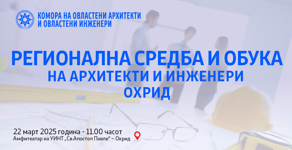 Регионалната средба на архитекти и инженери е планирано да се одржи во просториите на Амфитеатар на УИНТ „Св.Апостол Павле“ – Охрид  на 22.03. 2025 година (сабота) со почеток од 11:00 часот.